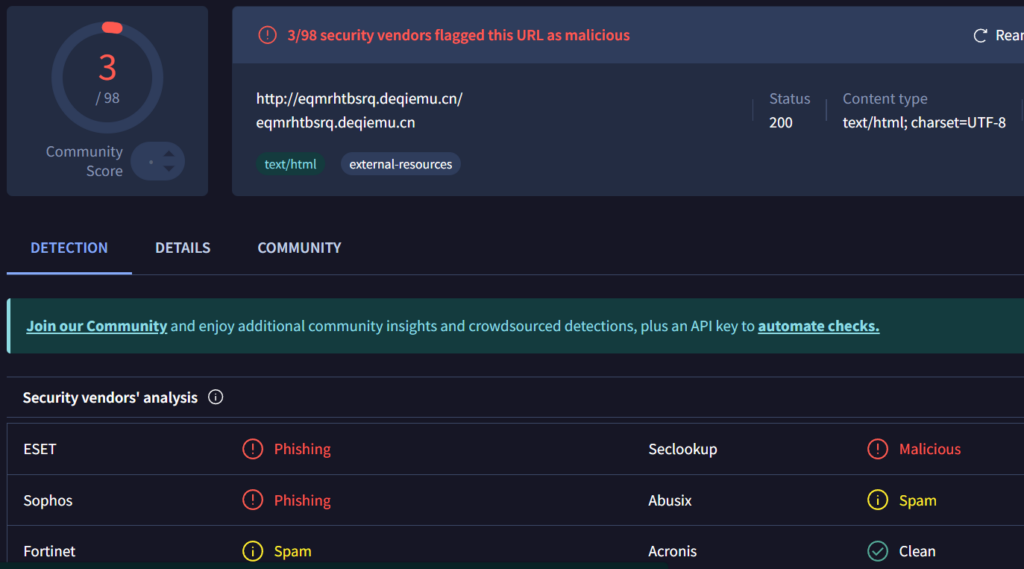 VirusTotalによると、スコアが3点で、フィッシングとスパムに利用されているURLと判明しました。