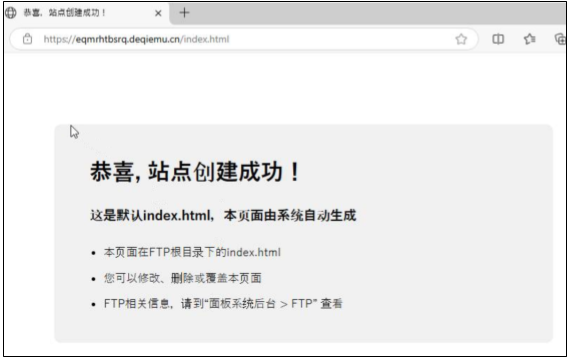 実際にリンクをアクセスしたところ、表示されたのは「サイト作成成功」の初期ページであり、攻撃用のコンテンツはすでに削除されているか、準備中であった可能性があります。