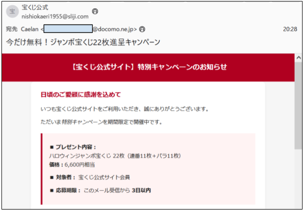 何億円と当選しているものより金額が現実的なので、一見すると宝くじ公式の案内のようですが、実際にはフィッシング目的の迷惑メールでした。
